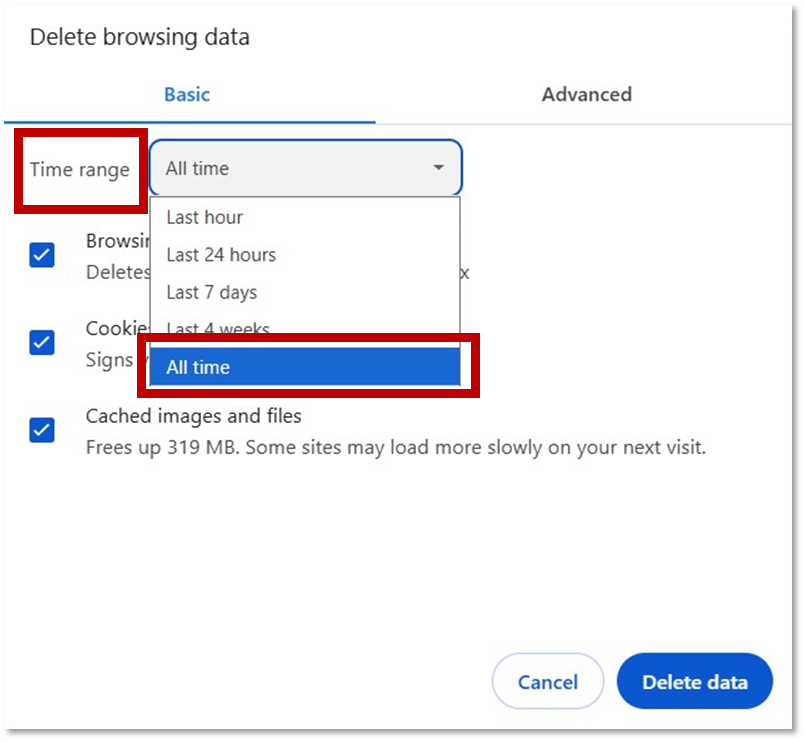 - You can choose the period of time for which you want to clear cached information. To clear your entire cache, select the beginning of time.