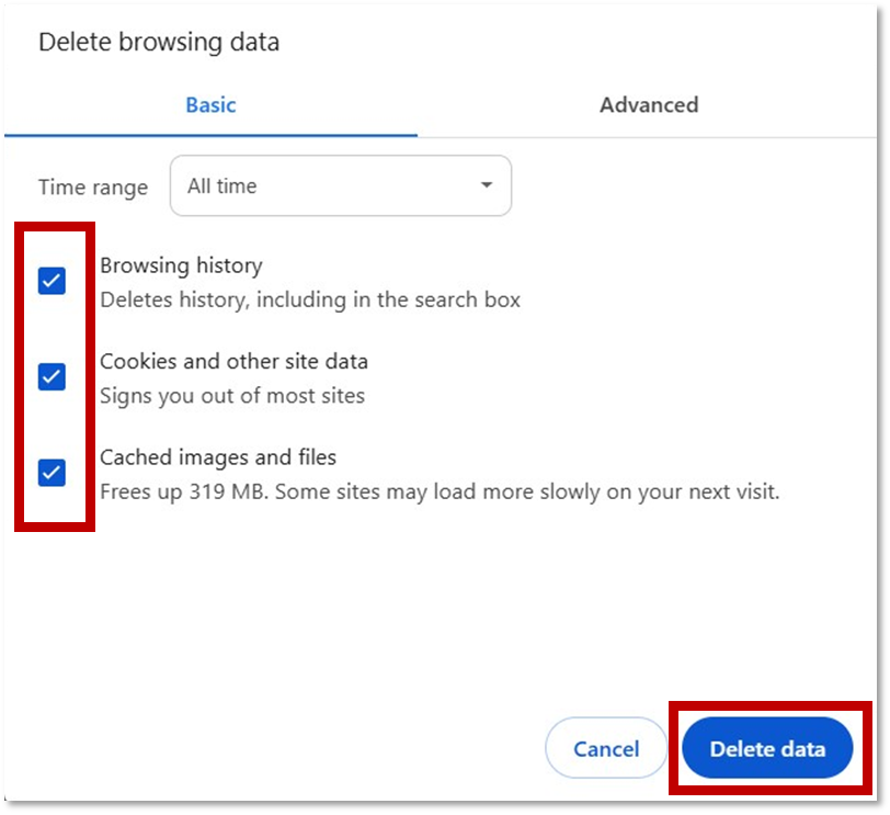 - Check all available boxes > select Delete data.