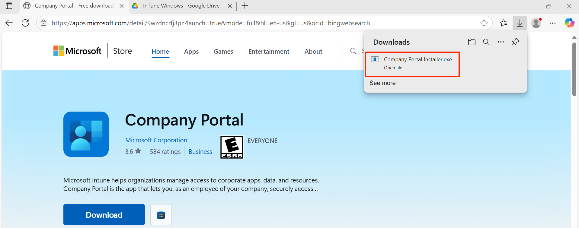 In the Downloads window, click “Company Portal Installer.exe” to open the installer.